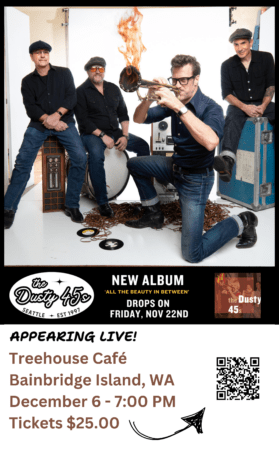 The Dusty 45s have toured extensively. They backed Rock and Roll Hall of famer, Wanda Jackson many times, including when they joined her for Adele’s “21” tour in 2011. The band has shared the stage with Brandi Carlile, Lyle Lovett, John Prine, The Ventures, Lucinda Williams, Leann Rhymes and Dick Dale, to name a few. In 2007, Huels received critical acclaim for his portrayal of Buddy Holly at Seattle’s 5th Avenue Theatre. In 2019, he interviewed PBS “Country Music” documentarian, Ken Burns, at Meany Hall in front of a sold-out audience.